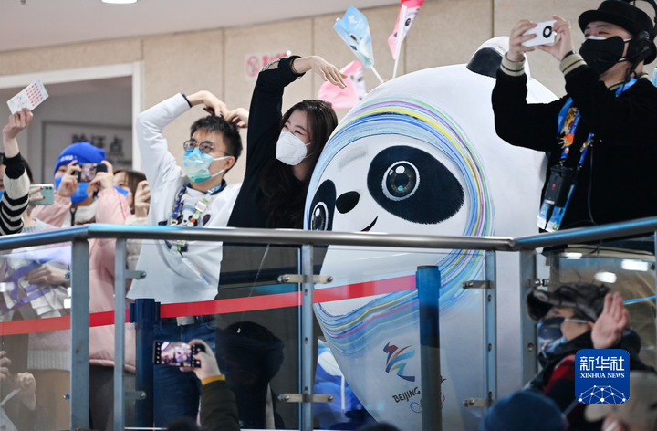 2月14日,吉祥物“冰墩墩”在北京2022年冬奧會女子冰球半決賽間隙和觀眾互動。新華社記者李然攝