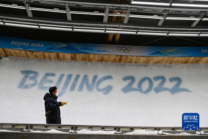 2月9日,一名制冰師在比賽間隙養(yǎng)護賽道。新華社記者孫非攝