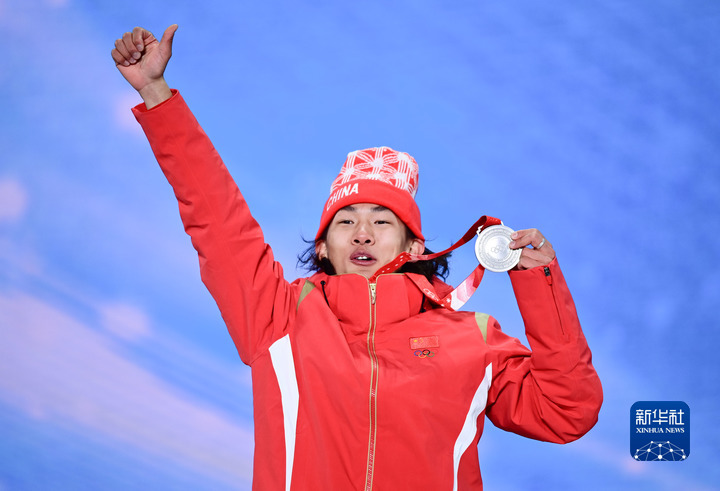 2月7日,亞軍中國選手蘇翊鳴在北京2022年冬奧會單板滑雪男子坡面障礙技巧獎牌頒發(fā)儀式上。新華社記者張宏祥攝