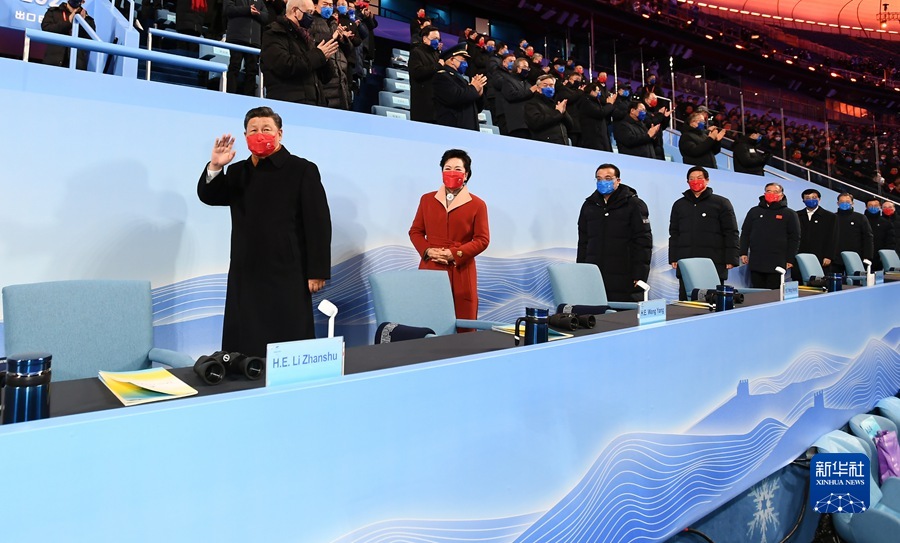 3月4日晚,北京2022年冬殘奧會開幕式在國家體育場隆重舉行。這是國家主席習近平同國際殘奧委會主席帕森斯在主席臺上向大家揮手致意。新華社記者 李學仁 攝