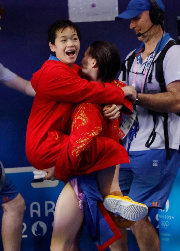 奪冠后陳芋汐一把抱起全紅嬋,還走了幾米,全紅嬋用手指比劃著捏東西的樣子!拔疫@就是拿捏的意思!”她在混合采訪區(qū)告訴記者。