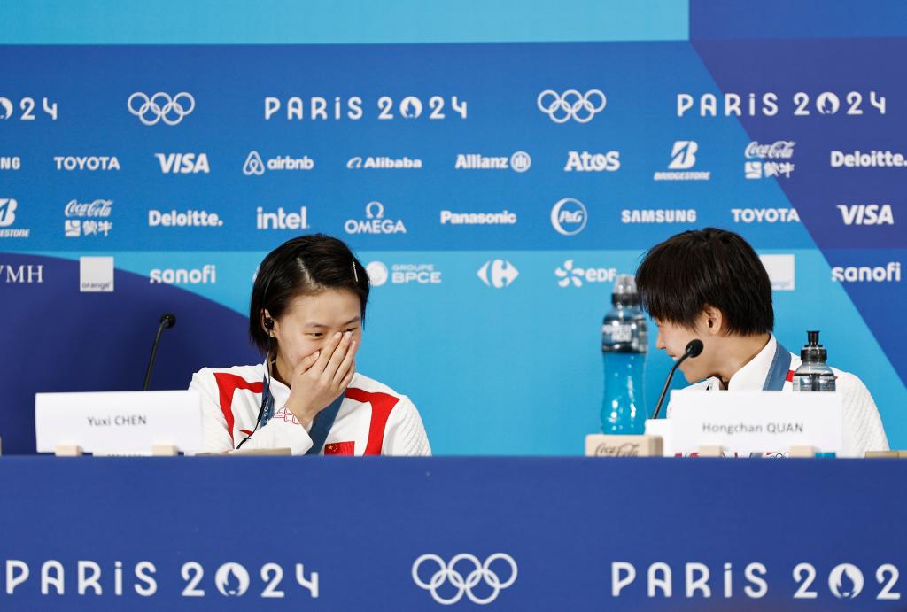 8月6日,全紅嬋(右)和陳芋汐在賽后記者會(huì)上。新華社記者 張玉薇 攝