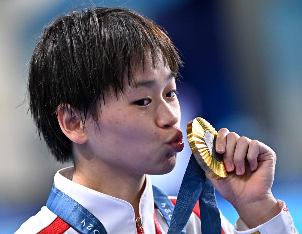 8月6日,全紅嬋親吻金牌。新華社記者 王鵬 攝