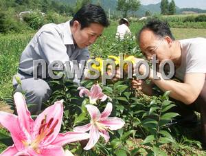 2005年8月4日,甘肅省天水市農(nóng)科所的兩名科技人員在基地觀察從荷蘭引進(jìn)的東方百合的生長(zhǎng)情況。