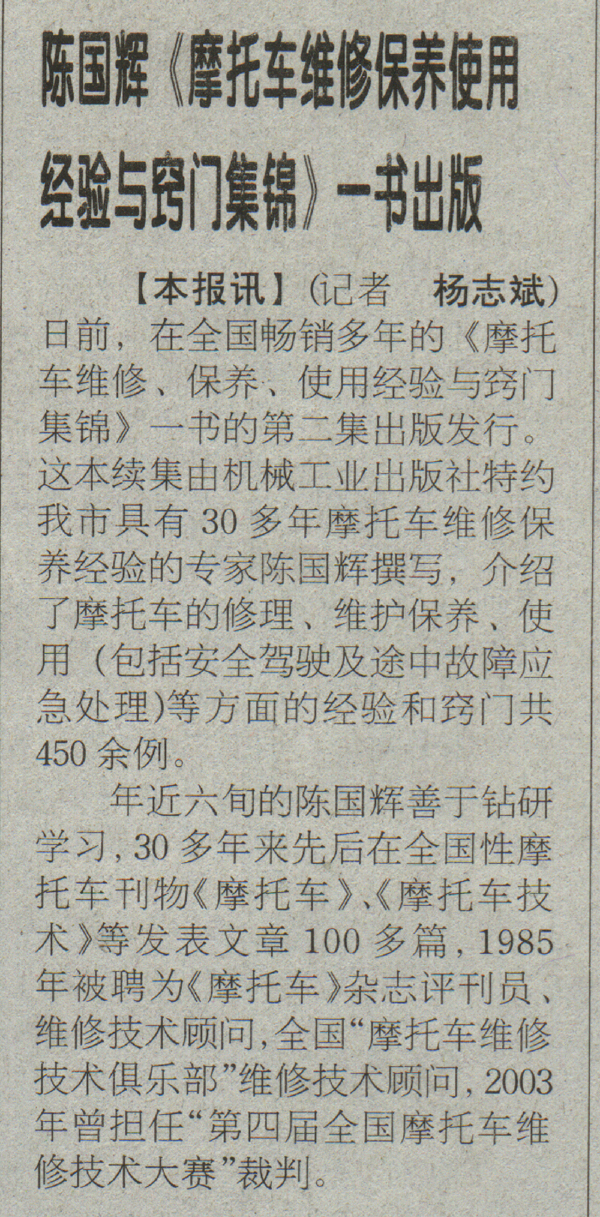 年近六旬的陳國輝善于鉆研學(xué)習(xí),30多年來先后在全國性摩托車刊物《摩托車》、《摩托車技術(shù)》等發(fā)表文章100多篇,1985年被聘為《摩托車》雜志評刊員、維修技術(shù)顧問,全國“摩托車維修技術(shù)俱樂部”維修技術(shù)顧問,2003年曾擔(dān)任“第四屆全國摩托車維修技術(shù)大賽”裁判。