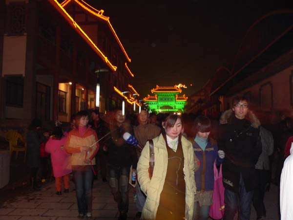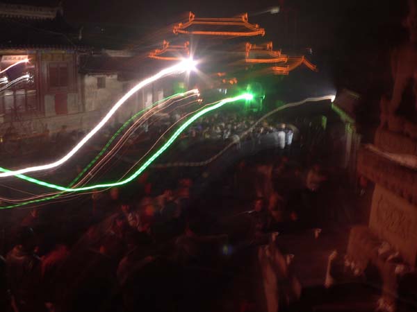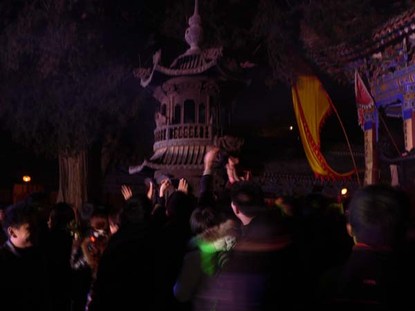 農(nóng)歷初八夜間,雖然天靖山上積雪還未完全消融,但自山腳直到玉泉觀玉皇殿及最高處三清殿,人們扶老攜幼,摩肩接踵,觀內(nèi)人潮涌動(dòng),熱鬧非凡。玉皇殿是更是被圍得水泄不通,正月初九凌晨,人們爭先恐后要為玉皇大帝點(diǎn)燃第—柱香,氣氛十分火爆。此時(shí),各殿堂燈火通明,香燭裊裊,旗幡飄舞,鐘磬齊鳴。