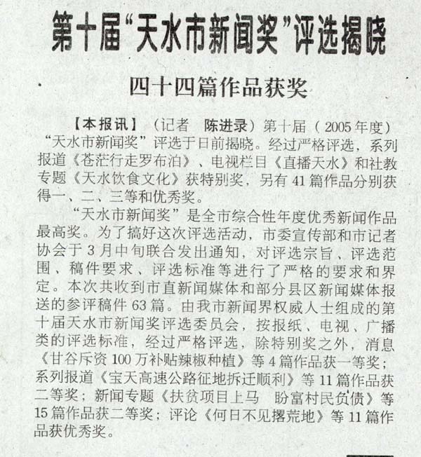 “天水市新聞獎(jiǎng)”是全市綜合性年度優(yōu)秀新聞作品最高獎(jiǎng)。為了搞好這次評選活動,市委宣傳部和市記者協(xié)會于3月中旬聯(lián)合發(fā)出通知,對評選宗旨、評選范圍、稿件要求、評選標(biāo)準(zhǔn)等進(jìn)行了嚴(yán)格的要求和界定。本次共收到市直新聞媒體和部分縣區(qū)新聞媒體報(bào)送的參評稿件63篇。由我市新聞界權(quán)威人士組成的第十屆天水市新聞獎(jiǎng)評選委員會,按報(bào)紙、電視、廣播類的評選標(biāo)準(zhǔn),經(jīng)過嚴(yán)格評選,除特別獎(jiǎng)之外,消息《甘谷斥資100萬補(bǔ)貼辣椒種植》等4篇作品獲一等獎(jiǎng);系列報(bào)道《寶天高速公路征地拆遷順利》等11篇作品獲二等獎(jiǎng);新聞專題《扶貧項(xiàng)目上馬 盼富村民負(fù)債》等15篇作品獲二等獎(jiǎng);評論《何日不見撂荒地》等11篇作品獲優(yōu)秀獎(jiǎng)。