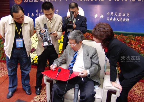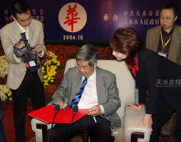 天水在線訊 2006年10月7日上午,在專訪全國人大常委會(huì)副委員長(zhǎng)、民進(jìn)中央主席許嘉璐的媒體見面會(huì)上,全國人大常委會(huì)副委員長(zhǎng)、民進(jìn)中央主席許嘉璐為天水電視臺(tái)《直播天水》欄目題詞。