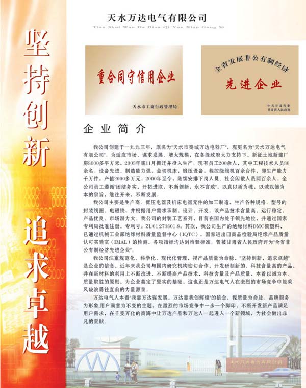 2003年“天水秦城萬(wàn)達(dá)電器廠”更名為“天水萬(wàn)達(dá)電氣有限公司” 任董事長(zhǎng)兼總經(jīng)理。