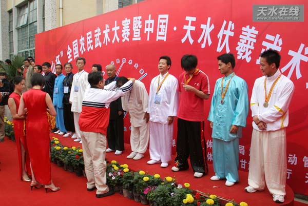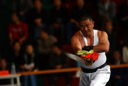 6月19日,運(yùn)動員在比賽中演示劍術(shù)。當(dāng)日,首屆全國農(nóng)民武術(shù)大賽在甘肅省天水市開賽。新華社記者聶建江攝