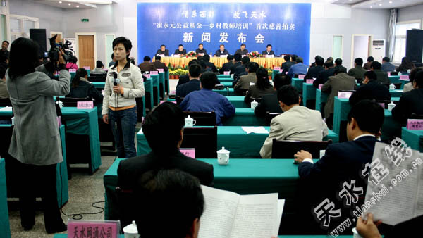 在當(dāng)日由天水市人民政府舉行的新聞發(fā)布會(huì)中,來自甘肅的100多位當(dāng)?shù)厣探缑骷皩?shí)力雄厚的公司負(fù)責(zé)人對(duì)活動(dòng)的舉辦給予極大熱情。來自新聞發(fā)布會(huì)的消息確定,“情系西部 放飛天水‘崔永元公益基金-鄉(xiāng)村教師培訓(xùn)’發(fā)布暨首次慈善拍賣”活動(dòng)將于2007年10月27日19時(shí)30分在甘肅天水秦州劇院舉行,屆時(shí)將有演藝界明星王菲、眉佳、宗曉林、羅中旭,著名畫家米景楊、書法家張有清等嘉賓參加拍賣活動(dòng)和文藝表演,活動(dòng)由央視節(jié)目主持人崔永元、敬一丹現(xiàn)場(chǎng)主持,中央電視臺(tái)《共同關(guān)注》欄目對(duì)整個(gè)活動(dòng)進(jìn)行現(xiàn)場(chǎng)錄制。
