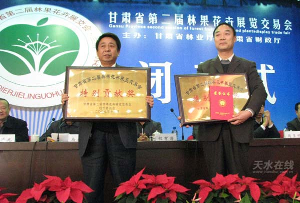 為表彰天水市委、市政府對林果產(chǎn)業(yè)的重視和在帶動(dòng)全省經(jīng)濟(jì)林果業(yè)的發(fā)展方面做出的貢獻(xiàn),甘肅省第二屆林果花卉展覽交易會組織委員會決定授予天水市“特別貢獻(xiàn)獎(jiǎng)”,獲得此獎(jiǎng)項(xiàng)的只有天水市和平?jīng)鍪袃杉摇A硗馕沂羞獲得了組織獎(jiǎng)和布展一等獎(jiǎng)。