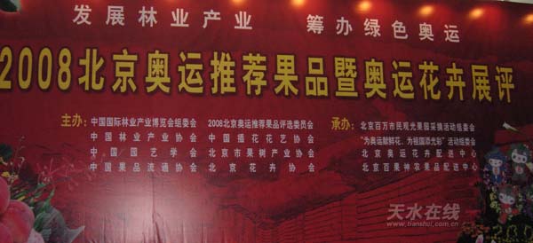 【天水在線訊】12月20日,2007中國國際林業(yè)博覽會在北京全國農(nóng)業(yè)展覽館隆重舉行,2008北京奧運推薦果品暨奧運花卉展評活動同時舉辦。此次展評活動由中國國際林業(yè)產(chǎn)業(yè)博覽會組委會、中國林業(yè)產(chǎn)業(yè)協(xié)會、2008北京奧運推薦果品評選委員會、中國果品流通學(xué)會等八家單位共同主辦。