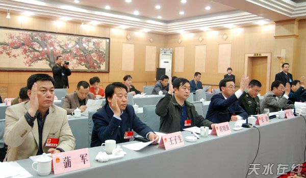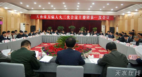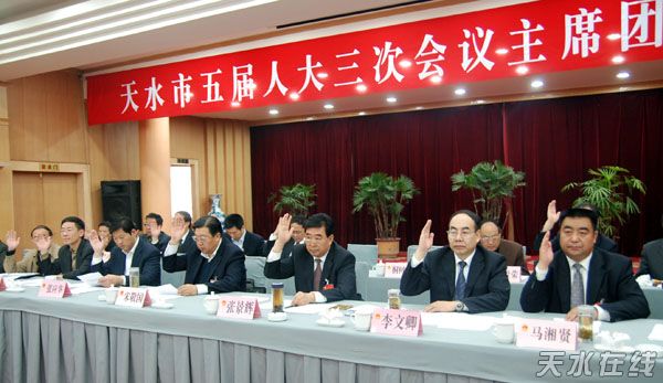 天水在線訊 2008年4月8日下午5:30,天水市五屆人大三次會(huì)議舉行主席團(tuán)第一次會(huì)議。主席團(tuán)成員65人,實(shí)到52人,符合法定人數(shù)。