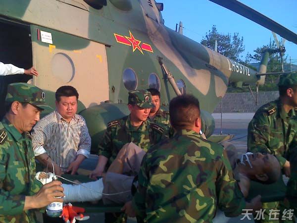當(dāng)天下午2時(shí)40分,由直升機(jī)從隴南市武都縣轉(zhuǎn)送的4名傷員、汽車(chē)從徽縣轉(zhuǎn)送的1名傷員在我市第一人民醫(yī)院接受治療。據(jù)了解,這5名傷員均有不同程度的外傷,其中4名病人病情基本穩(wěn)定,1名病人病情較重,市第一人民醫(yī)院組織了有關(guān)專家全力搶救。
