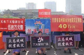 天水在線訊 5月16日上午,由市委、市政府倡導(dǎo),天水市工商聯(lián)合會(huì)、市企業(yè)家協(xié)會(huì)、市光彩事業(yè)促進(jìn)會(huì)聯(lián)合發(fā)起并舉辦的全市工商企業(yè)界“抗震救災(zāi)獻(xiàn)愛心”捐款儀式在龍城廣場(chǎng)隆重舉行。我市的40多家企業(yè)及個(gè)人紛紛向受災(zāi)群眾伸出援助之手,奉獻(xiàn)愛心,募集資金600多萬元。這些款項(xiàng)將通過“慈善”、“光彩事業(yè)”等渠道用于災(zāi)區(qū)人民恢復(fù)生產(chǎn)、重建家園。