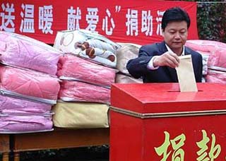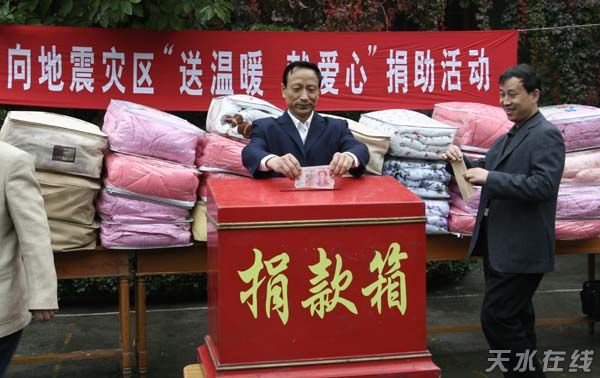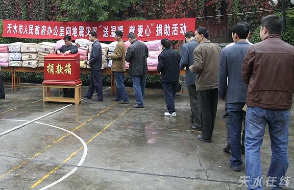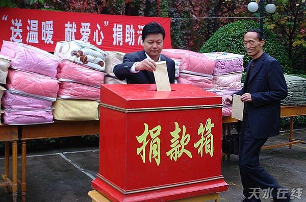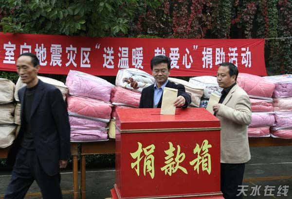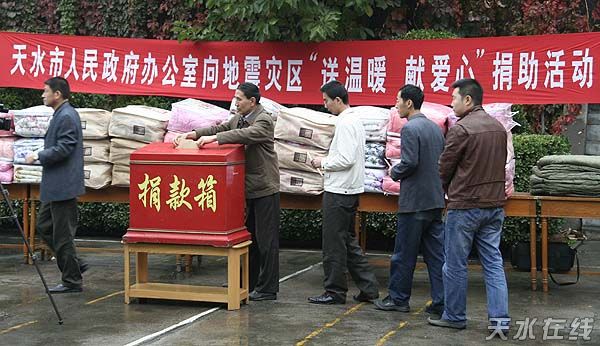 天水在線報道 10月15日上午,天水市政府辦公室向地震災(zāi)區(qū)“送溫暖 獻(xiàn)愛心”捐助活動在市政府大院舉行。