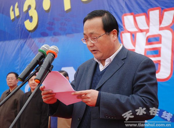 市人大常委會副主任韓一兵、副市長趙衛(wèi)東、市政協(xié)副主席馮進(jìn)福、市委宣傳部副調(diào)研員趙彥玲、市文明辦主任李德榮,秦州區(qū)人大副主任馬有福、副區(qū)長成少平、區(qū)政協(xié)副主席李廣鳴等領(lǐng)導(dǎo)同志應(yīng)邀出席了紀(jì)念大會。副市長趙衛(wèi)東和市工商局黨組書記、局長楊凱銘分別作了重要講話。紀(jì)念大會由市政府副秘書長安定文主持。市工商局領(lǐng)導(dǎo)班子全體成員,天水市暨秦州區(qū)質(zhì)監(jiān)、衛(wèi)生、藥監(jiān)、物價等行政執(zhí)法部門負(fù)責(zé)人,各常務(wù)理事單位和理事單位的負(fù)責(zé)人,市工商局及秦州分局工商行政管理執(zhí)法人員,部分企業(yè)和個體工商經(jīng)營者代表參加了紀(jì)念大會。