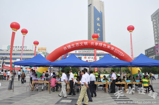 6月5日是第40個(gè)世界環(huán)境日,我國的主題為“共建生態(tài)文明,共享綠色未來”。當(dāng)天,市環(huán)保局、市科協(xié)、秦州區(qū)環(huán)保局等部門在市龍城廣場通過開展環(huán)保咨詢,設(shè)立環(huán)保宣傳圖片展板、科普知識展板、環(huán)保海報(bào)作品展,散發(fā)宣傳資料和環(huán)保手冊,糾正不良環(huán)境行為活動(dòng)等形式開展主題宣傳活動(dòng)。