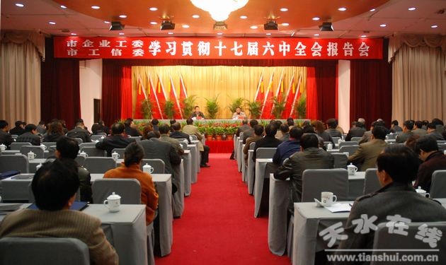 按照市委宣傳部《關(guān)于組織開(kāi)展黨的十七屆六中全會(huì)及市第六次黨代會(huì)精神宣講活動(dòng)的通知》要求,11月28日下午,市企業(yè)工委、市工信委系統(tǒng)舉行學(xué)習(xí)貫徹十七屆六中全會(huì)精神報(bào)告會(huì)。天水市企業(yè)工委書(shū)記、市工信委副書(shū)記、副主任何曉斌主持會(huì)議。企業(yè)工委所屬65戶(hù)企業(yè)負(fù)責(zé)人、企業(yè)工委和工信委機(jī)關(guān)全體干部職工以及機(jī)關(guān)離退休支部170多人聆聽(tīng)了報(bào)告。