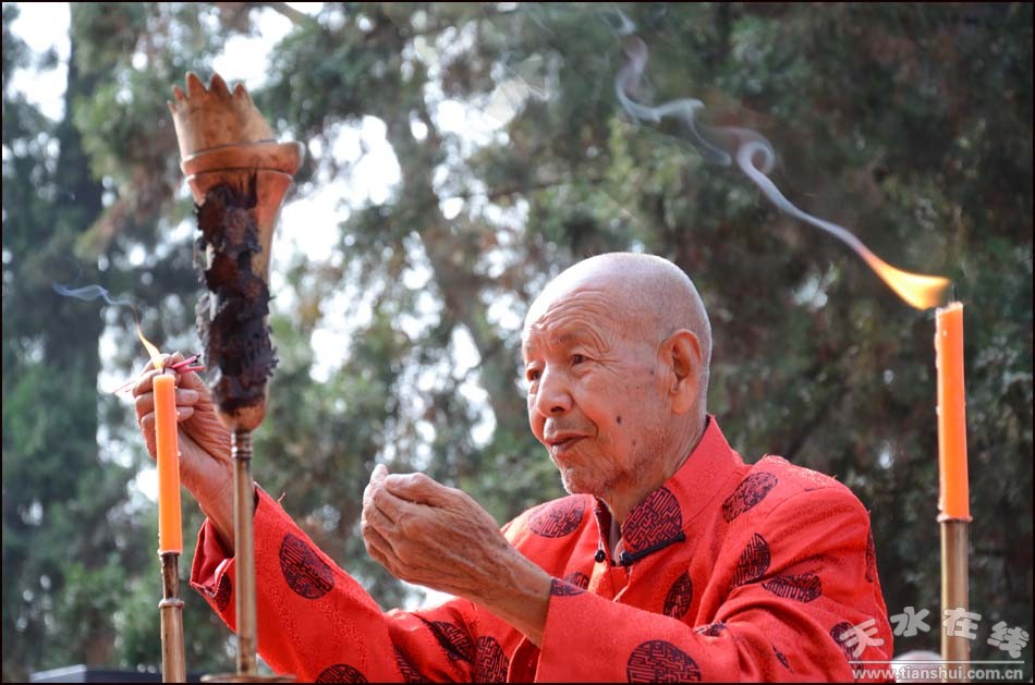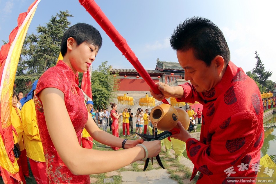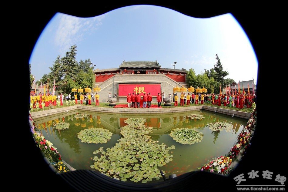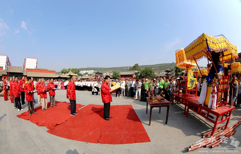 8月31日,天水伏羲廟內(nèi)龍旗獵獵,嗩吶陣陣,在先天殿月臺(tái)伏羲行像前悠揚(yáng)的古琴演奏聲中,浩大的祭祀隊(duì)伍按照傳統(tǒng)禮儀,舉行迎神,取圣水,出榜文等儀式,標(biāo)志著乙未(2015)年秋祭中華民族人文始祖太昊伏羲氏典禮正式開始,數(shù)萬市民和游客觀看了第一天的祭祀典禮儀式。