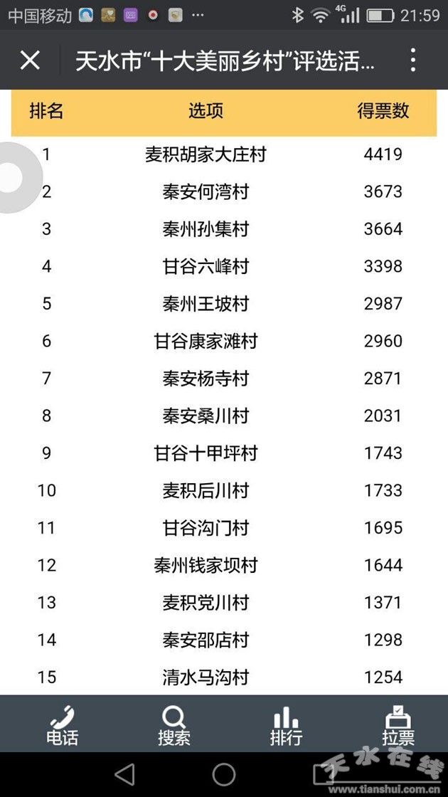 關(guān)注“天水在線(xiàn)微信公眾平臺(tái)”(微信號(hào):tianshui-com-cn ),回復(fù)“美麗鄉(xiāng)村”,進(jìn)入“天水市“十大美麗鄉(xiāng)村”評(píng)選活動(dòng)”投票界面;