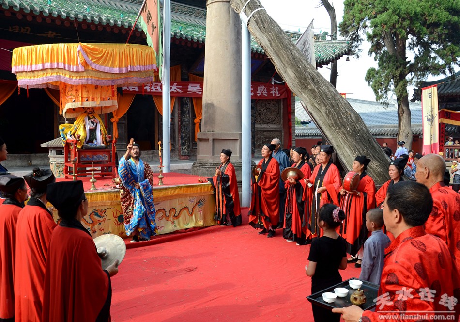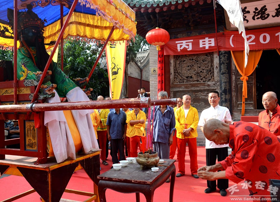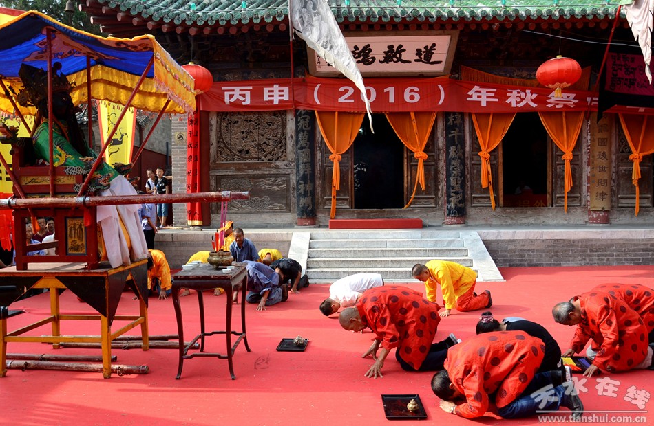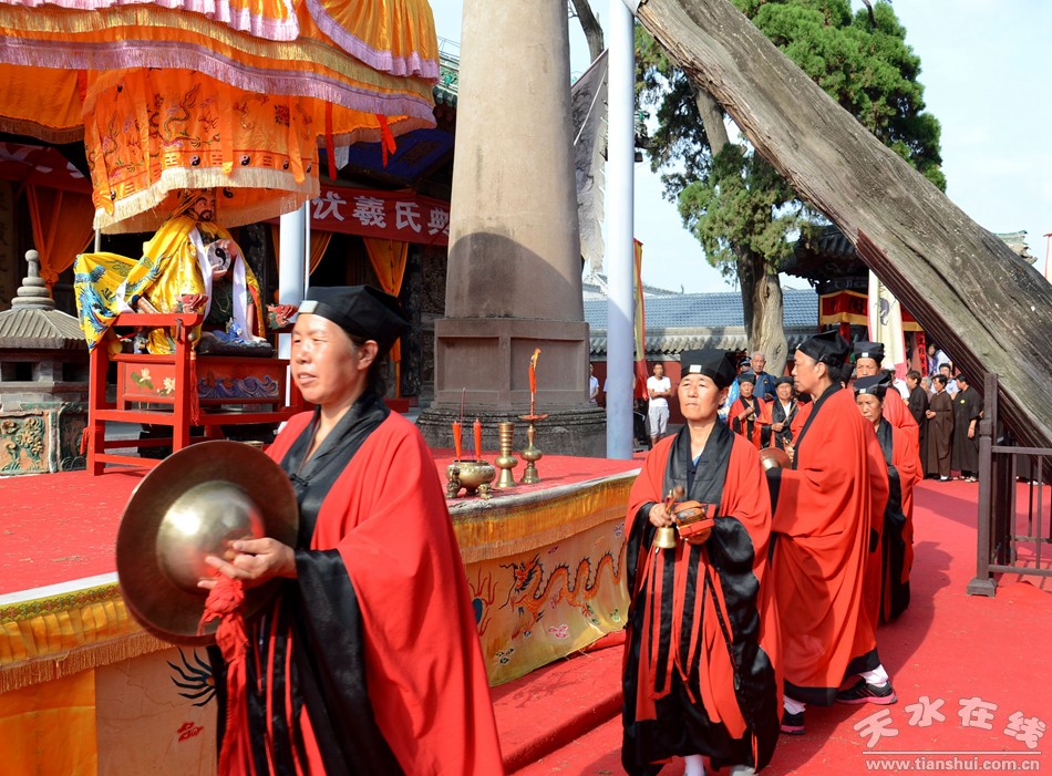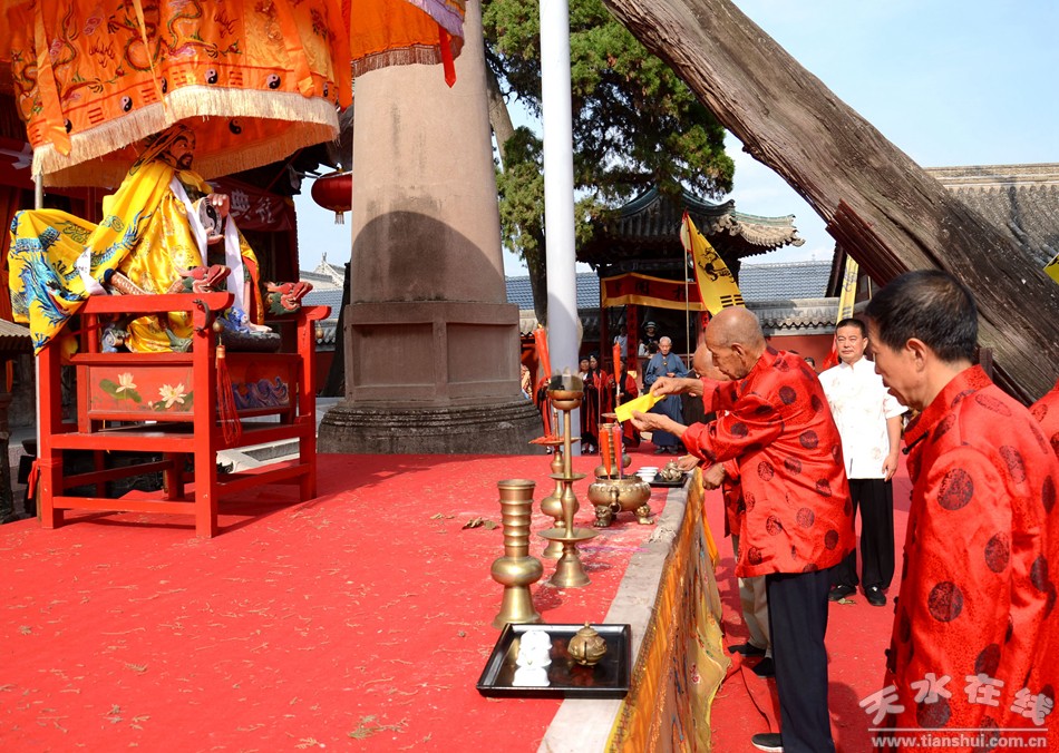 8月22日下午,天水伏羲廟舉行丙申(2016)年秋祭中華民族人文始祖太昊伏羲氏典禮之送神、送圣水、焚燒榜文儀式。主要議程有:請方神黑爺至伏羲廟先天殿月臺,明燭、上香、化表、獻茶;在伏羲廟外方神廟前舉行送圣水、焚燒榜文儀式,恭送伏羲神位仙升。