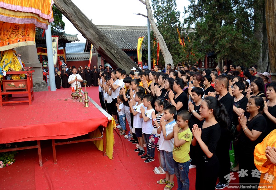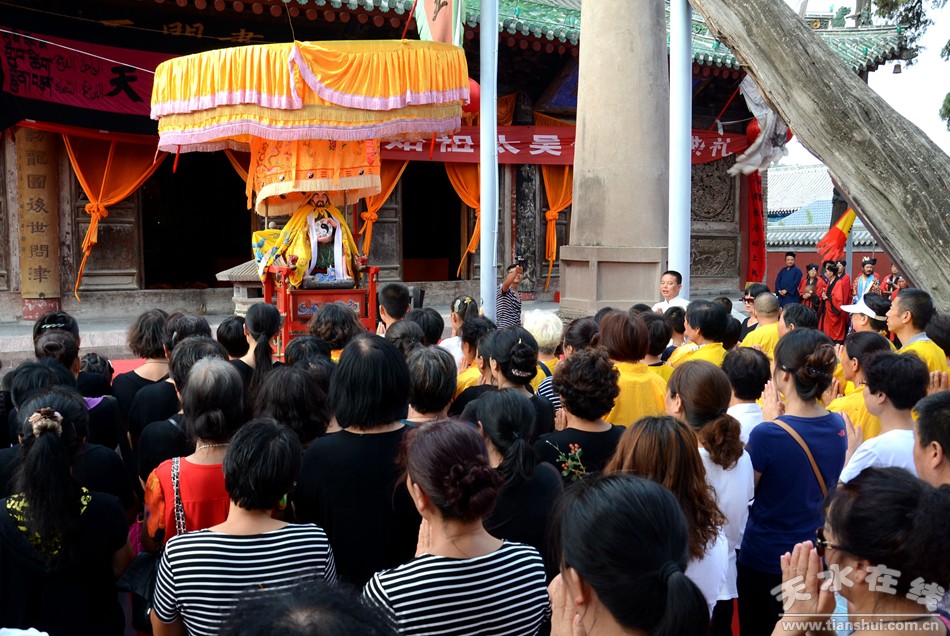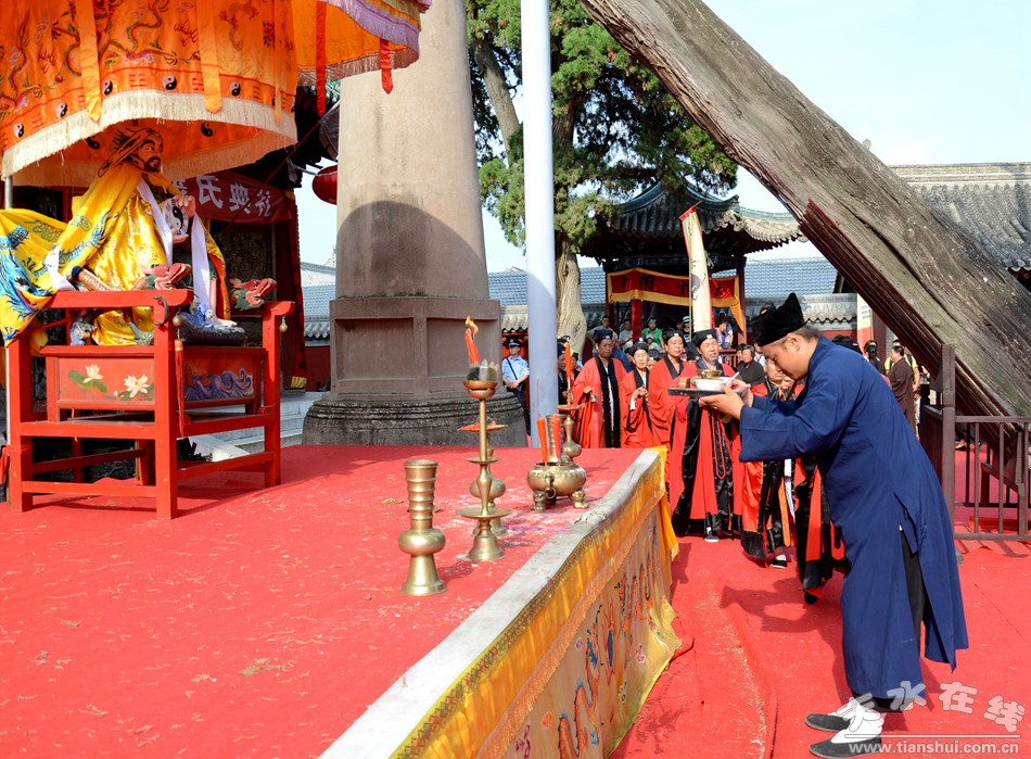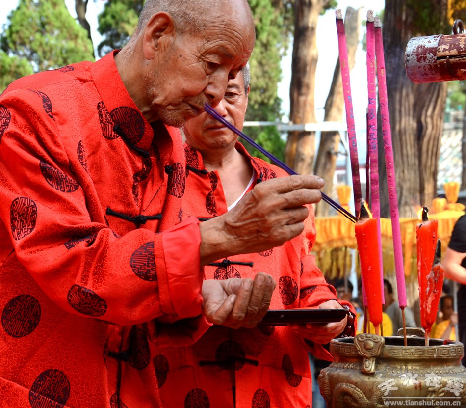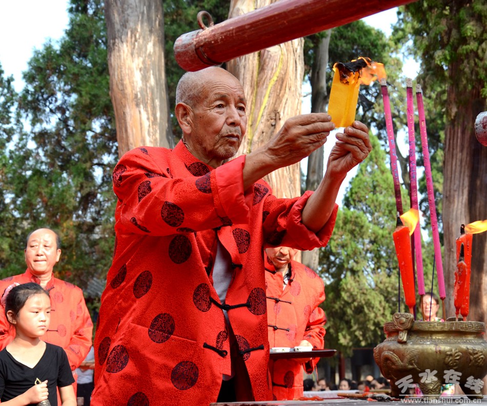 8月22日下午,天水伏羲廟舉行丙申(2016)年秋祭中華民族人文始祖太昊伏羲氏典禮之送神、送圣水、焚燒榜文儀式。主要議程有:請方神黑爺至伏羲廟先天殿月臺,明燭、上香、化表、獻茶;在伏羲廟外方神廟前舉行送圣水、焚燒榜文儀式,恭送伏羲神位仙升。