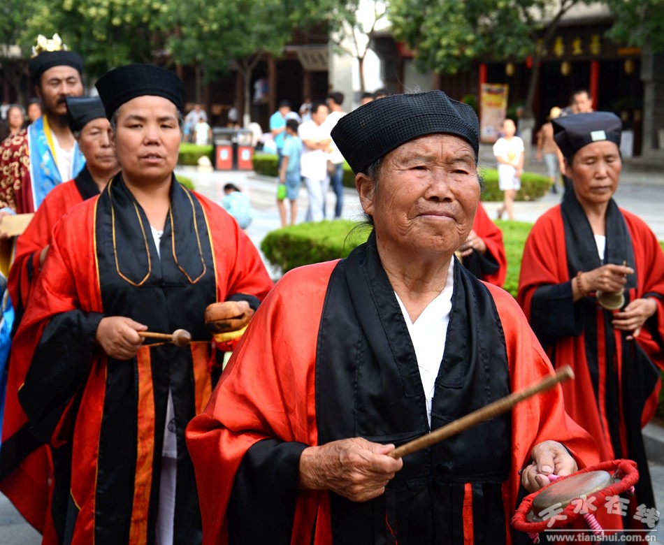 ▲儀仗隊(duì)、嗩吶隊(duì)等送神隊(duì)伍從伏羲廟內(nèi)出發(fā),將繞伏羲城一周,然后在方神廟前舉行送圣水、焚燒榜文儀式。