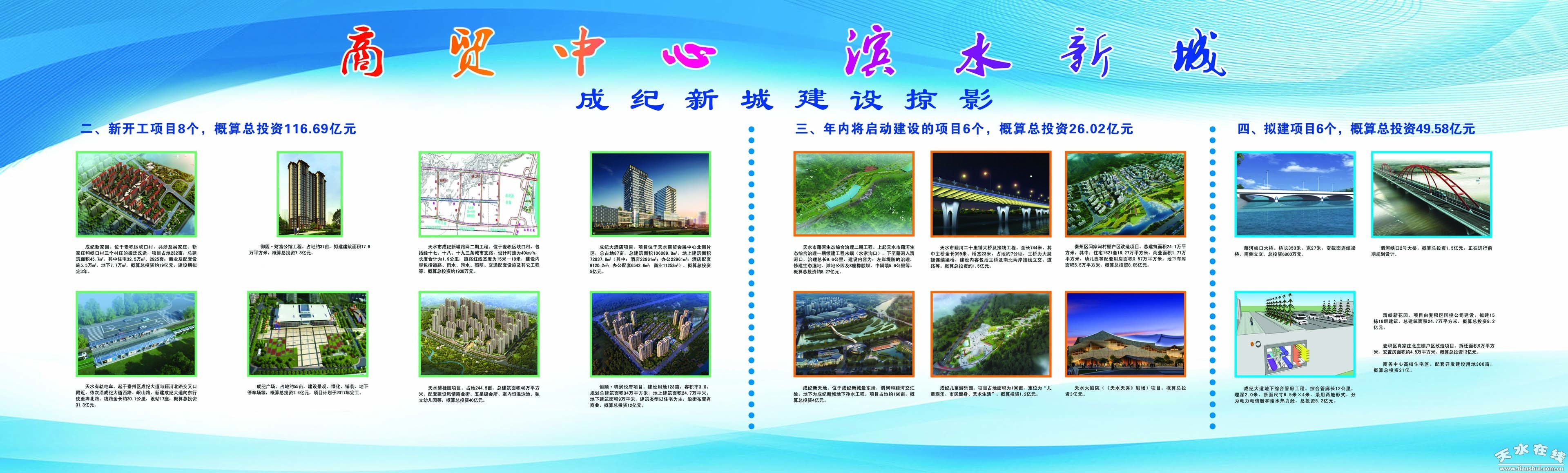 成紀(jì)新城位于天水市東西向段中心位置,東起渭河,西以藉河七里墩天巉公路橋為界,南以秦麥高速為界,北至北山脊線,包括秦州區(qū)閆家河灣至麥積區(qū)峽口藉河河道及以北區(qū)域(含北山南麓),規(guī)劃面積17.6平方公里,一期規(guī)劃面積9.5平方公里(其中規(guī)劃建設(shè)用地6000畝,北山生態(tài)公園占地8250畝),是天水發(fā)展商貿(mào)會展、房產(chǎn)開發(fā)、科教文化、旅游產(chǎn)業(yè)、體育產(chǎn)業(yè)的重要功能區(qū)和城市中央商務(wù)區(qū)。目前,新城內(nèi)已啟動實施億元以上的項目35個,總投資256.21億元。其中已建成和在建的項目23個,主要包括:成紀(jì)大道及防洪綜合治理工程、成紀(jì)大道高架橋、藉河孫家坪大橋、渭河峽口1號大橋、天水會展中心、天水文化藝術(shù)館、天水商貿(mào)城系列場館、成紀(jì)廣場、天水一中麥積分校、天水市體育中心、天水有軌電車、藉河羅家溝大橋及接線工程、成紀(jì)新城地下凈水工程、成紀(jì)新城一期路網(wǎng)工程、成紀(jì)新城二期路網(wǎng)工程、北山生態(tài)園、成紀(jì)新家園、成紀(jì)?漆t(yī)院綜合樓、隴上尊裕、御園•財富公館、天水碧桂園、恒順•錦潤悅府、成紀(jì)大酒店等項目;啟動前期工作即將動工建設(shè)的項目6個:主要包括藉河二十里鋪大橋及接線工程、藉河生態(tài)綜合治理二期工程、秦州區(qū)閆家河村棚戶區(qū)改造項目、成紀(jì)新天地、天水大劇院(《天水天秀》劇場)、成紀(jì)兒童游樂園等項目;擬建項目6個:主要包括藉河峽口大橋、渭河峽口2號大橋、成紀(jì)大道地下綜合管廊工程、麥積區(qū)肖家莊北莊棚戶區(qū)改造項目、商務(wù)中心高檔住宅區(qū)、渭峽新花園等項目。