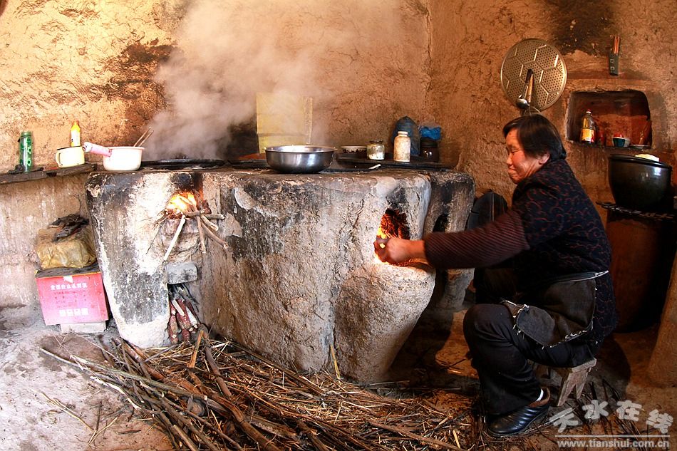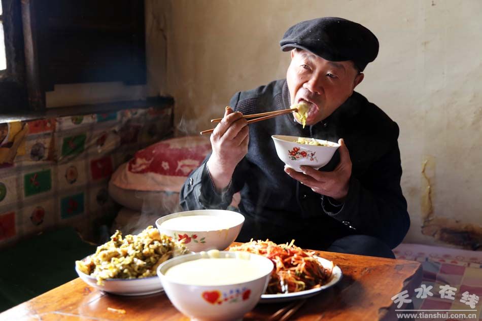 在古老的天水,每當(dāng)冬季來臨,氣溫一天天下降,時不時的有陣陣?yán)淇諝鈦硪u,在寒冷的日子里,一碗熱乎乎的馓面飯便成為驅(qū)寒暖身的最美佳肴。做馓面飯是一門藝術(shù)。以當(dāng)年的新鮮玉米,用石磨磨成的面最香。做時,先用大火將鐵鍋里的水燒開,然后放進(jìn)大塊的土豆塊,右手執(zhí)一長竹筷,左手抓適量玉米面邊往鍋里拋灑,一邊灑一邊用竹筷勻速攪動,這時候雙手一定要配合默契,要不然面在鍋里會結(jié)成疙瘩,待到稀稠適當(dāng),鍋里形成糊狀時,核桃般大的氣泡從鍋里“撲哧撲哧”地往出冒,再用大勺來回攪拌,這時蓋上鍋蓋,用細(xì)火慢燉少許時間,一鍋香蓬蓬、伴著新鮮玉米面和土豆特殊香味的馓面飯便出鍋了。 馓飯做熟后,還得有下飯吃的菜,天水人叫“下”菜。“下”菜的種類很多,多可數(shù)十種,少則一兩種,最常見的是炒青椒、炒土豆絲、涼拌胡蘿卜絲、涼拌蘿卜、熗酸菜和各種腌制的泡菜。在麥積區(qū)和清水縣,還有一種特別的“下”菜——“麻菜”,因這里盛產(chǎn)花椒,每年霜降之后,家家將經(jīng)過霜浸過的大白菜和卷心菜放在大鍋里過水后晾涼,一層一層碼在缸中,灑上食鹽和花椒粒,缸口用大小適宜的石頭鎮(zhèn)壓發(fā)酵成熟。一月之后,清脆可口、帶著濃郁椒香味的“麻菜”便制成了,“麻菜炒豆腐”是吃馓飯最好的“下”菜。過去,農(nóng)村生活條件差,冬天的新鮮蔬菜少,一缸“麻菜”就是一家人整個冬天的菜壇子。雨雪天,端上一碗熱乎乎的馓飯,一家人圍坐在炕頭,外面天寒地凍,屋內(nèi)卻熱氣騰騰,溫暖從捂著馓飯碗的手漸漸融化到心里,是多么溫馨的事!吃馓飯也很講究,要從碗邊或中間一筷一筷地?fù)破穑种械耐胍粩嗟男D(zhuǎn),吃到碗底馓飯都是熱乎乎的,而且吃過的碗特別干凈。外地人不會吃,嫌這樣太麻煩,干脆端起來一喝了之,這可是吃馓飯的大忌,是最煞風(fēng)景的。