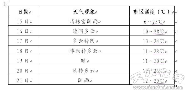 未來一周我市天氣晴雨相間,氣溫將逐漸回升。預(yù)計:今天白天到夜間晴轉(zhuǎn)雷陣雨,16日晴間多云,19~20日晴,17~18日、21日受高原槽和北方弱冷空氣影響,我市將出陣雨天氣過程。具體預(yù)報如下表所示: