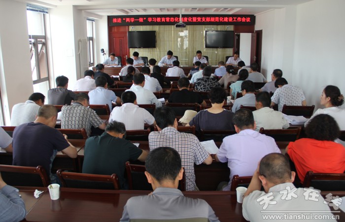 6月19日,天水市農(nóng)業(yè)局召開推進“兩學一做”學習教育常態(tài)化制度化暨黨支部規(guī)范化建設工作會議,會議傳達貫徹全市推進“兩學一做”學習教育常態(tài)化制度化工作會議、全市黨支部規(guī)范化建設工作會議以及市委意識形態(tài)工作會議精神,研究部署貫徹落實工作。局黨組成員,各黨支部書記、黨務工作者,機關全體黨員共60余人參加了會議。