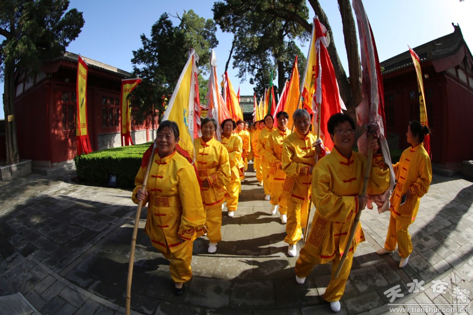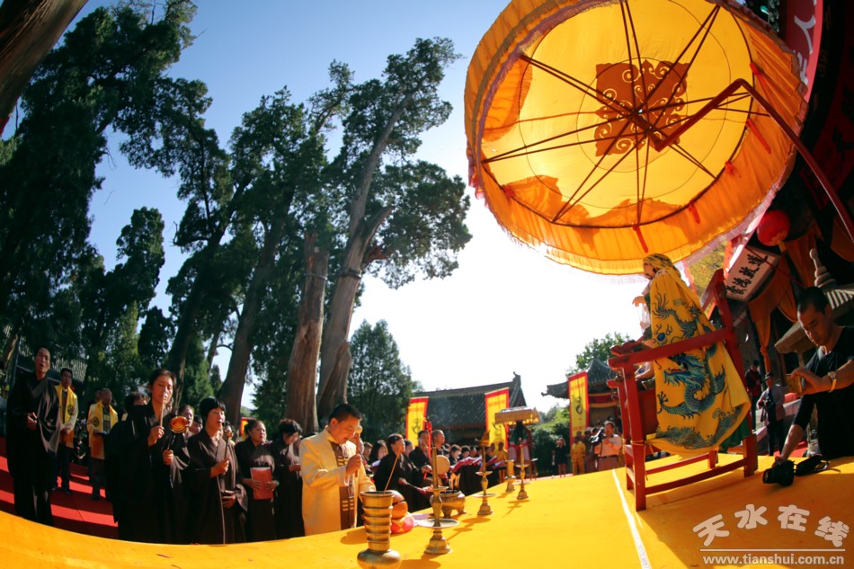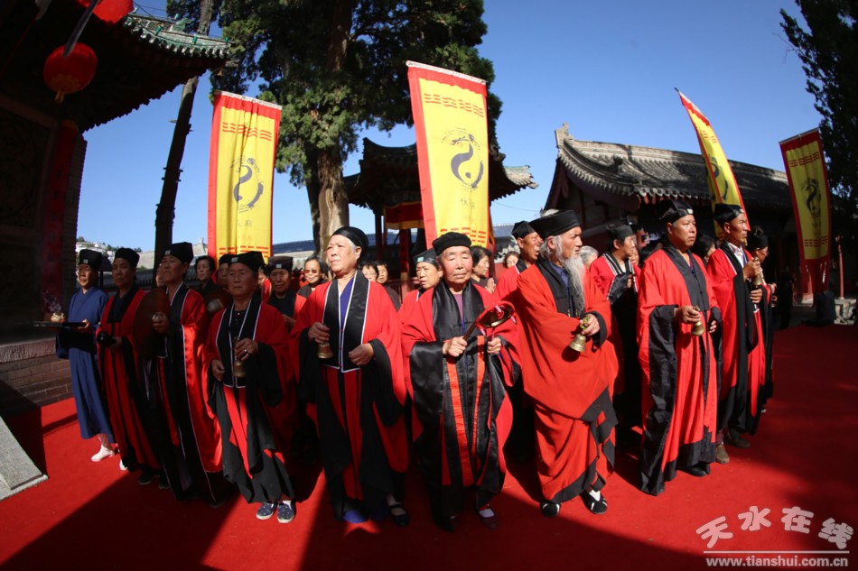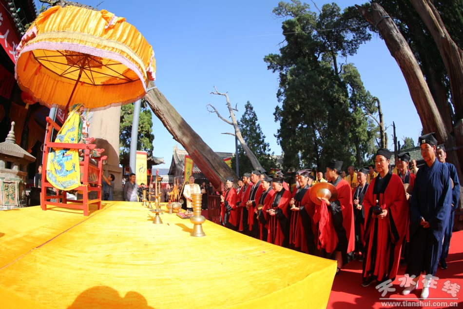 當(dāng)天下午16時許,丁酉(2017)年秋祭伏羲典禮舉行了送神、送圣水、焚燒榜文儀式。儀式依照請方神黑爺至伏羲廟先天殿月臺伏羲圣像前依次展開,由主祭人、助祭人明燭、上香、化表、獻茶、誦經(jīng)、唱頌。隨后,方神黑爺在浩浩蕩蕩依仗隊伍的簇擁下繞伏羲城一周,至伏羲廟西牌坊前舉行送圣水、焚燒榜文儀式,恭送伏羲神位仙升。