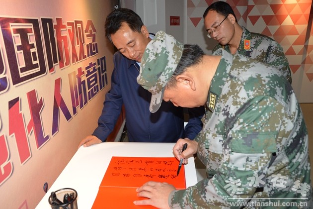 在檢查調(diào)研時(shí),李建中對(duì)近年來(lái)天水人防全面建設(shè)創(chuàng)新發(fā)展取得的成績(jī)給予“新特奇,高大上,靚麗美,真管用”的高度評(píng)價(jià)。李建中司令員在市人防宣教體驗(yàn)館的留言薄上提詞,寄語(yǔ)天水人防事業(yè),“記住已有的輝煌,未來(lái)的更高目標(biāo)仍需攀登。祝天水人防事業(yè),百尺桿頭更進(jìn)一步”。并強(qiáng)調(diào),市人防辦要認(rèn)真抓好全國(guó)、全省人民防空會(huì)議精神和全市人防工作暨黨風(fēng)廉政建設(shè)座談會(huì)精神的貫徹落實(shí),深入推進(jìn)全市人防建設(shè)事業(yè)深入創(chuàng)新發(fā)展。要在定實(shí)更高人防建設(shè)目標(biāo)上下功夫,要在加強(qiáng)統(tǒng)籌協(xié)調(diào)上下功夫,要在狠抓任務(wù)落實(shí)上下功夫,確保年度既定的各項(xiàng)工作目標(biāo)任務(wù)圓滿完成,確保取得新的更大的成績(jī)。