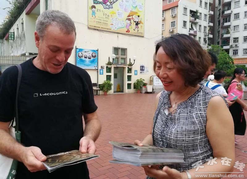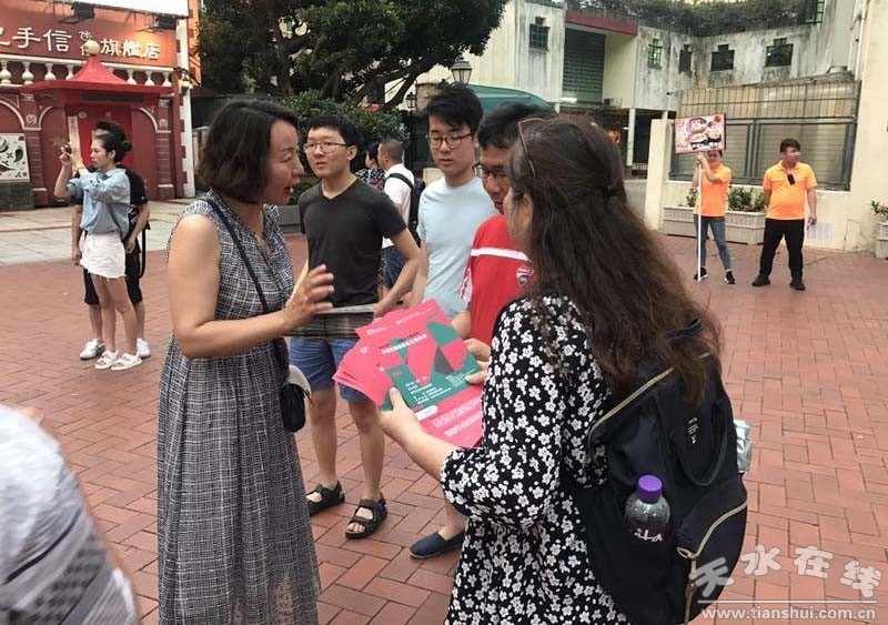 (在演出現(xiàn)場,向外賓和澳門市民發(fā)送中英文天水旅游畫冊。)