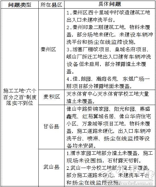 近期,市大氣辦已對各縣區(qū)“冬防”措施落實情況開展了五批現(xiàn)場調(diào)度,前四批現(xiàn)場調(diào)度共下發(fā)現(xiàn)場交辦單164個,涉及突出環(huán)境問題200個,截止目前已完成整改并上報整改報告的93個,還有71個未上報整改情況。其中秦州區(qū)及市直有關(guān)部門交辦69個問題,秦州區(qū)整改并上報47個,未上報19個,市直部門未上報3個;麥積區(qū)及開發(fā)區(qū)交辦問題48個,整改并上報38個,麥積區(qū)未上報7個,開發(fā)區(qū)未上報3個;甘谷縣交辦問題6個,整改并上報1個,未上報5個;秦安縣交辦問題10個,未上報10個;武山縣交辦問題9個,整改并上報1個,未上報8個;清水縣交辦問題15個,整改并上報4個,未上報11個;張家川縣交辦問題7個,整改并上報2個,未上報5個。