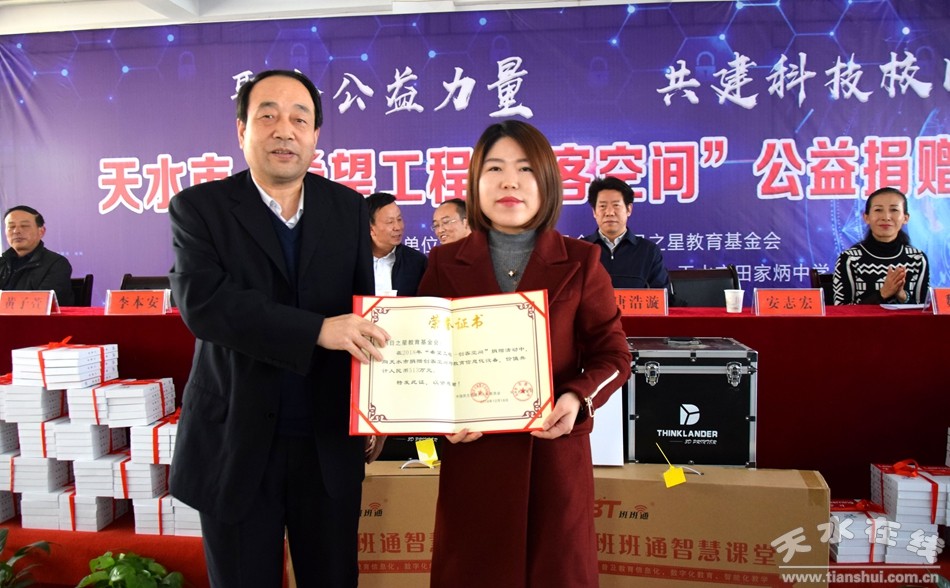 (天水市人大常委會(huì)副主任、民盟天水市委會(huì)主委安志宏為明日之星教育基金會(huì)頒發(fā)榮譽(yù)證書)