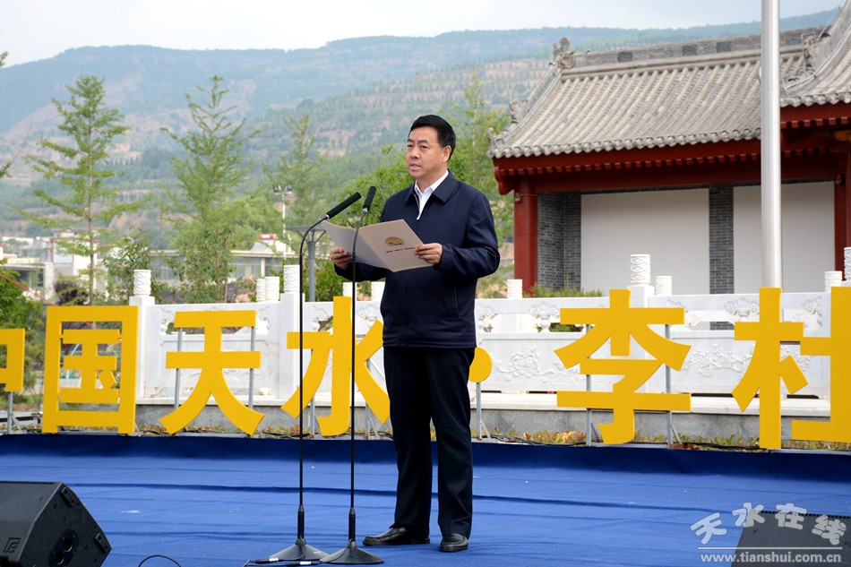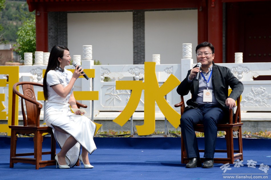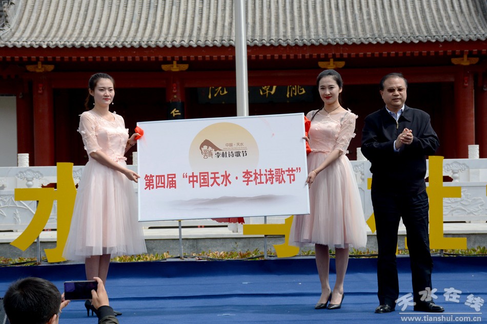 (人民日?qǐng)?bào)社甘肅分社社長(zhǎng)董洪亮為第四屆“中國(guó)天水·李杜詩(shī)歌節(jié)”標(biāo)徽揭幕。)