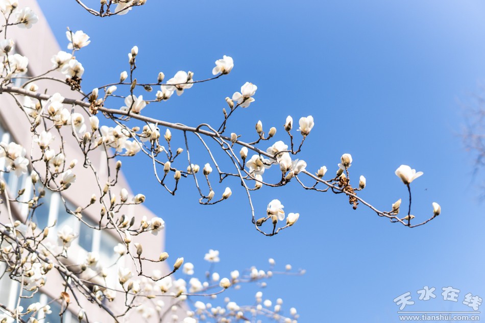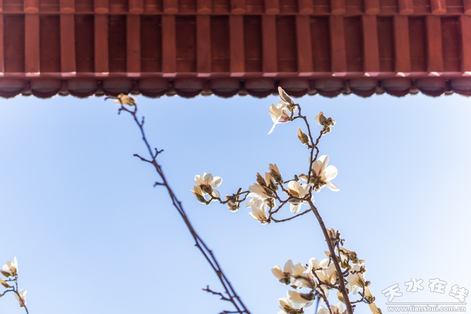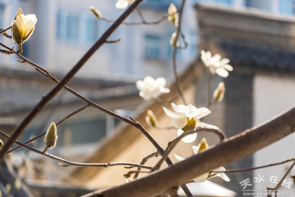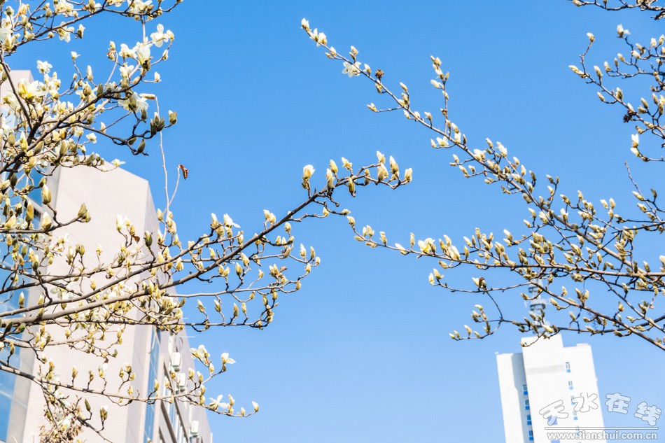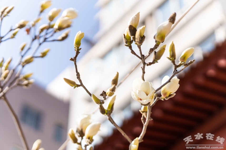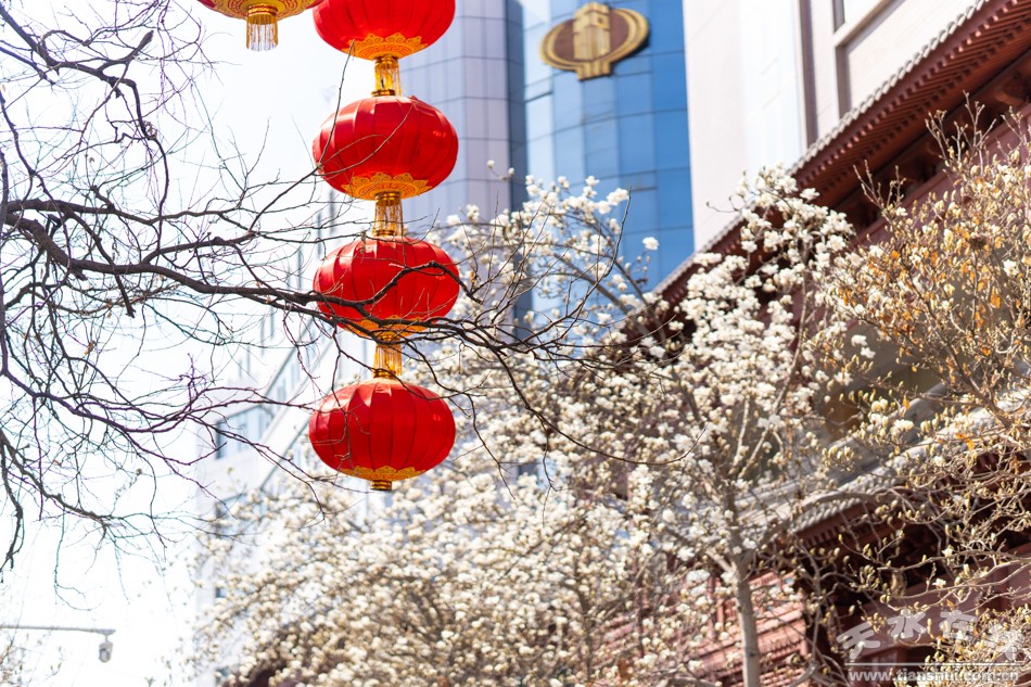 2月23日,位于天水市秦州區(qū)自由路,被稱為網(wǎng)紅街“玉蘭古巷”的玉蘭,相繼悄然綻放,比往年開的更早一些。在藍色天幕、黛瓦白墻、紅色串燈的映襯下,近百株或含苞或怒放的玉蘭花,給這座古城帶來了春的氣息。