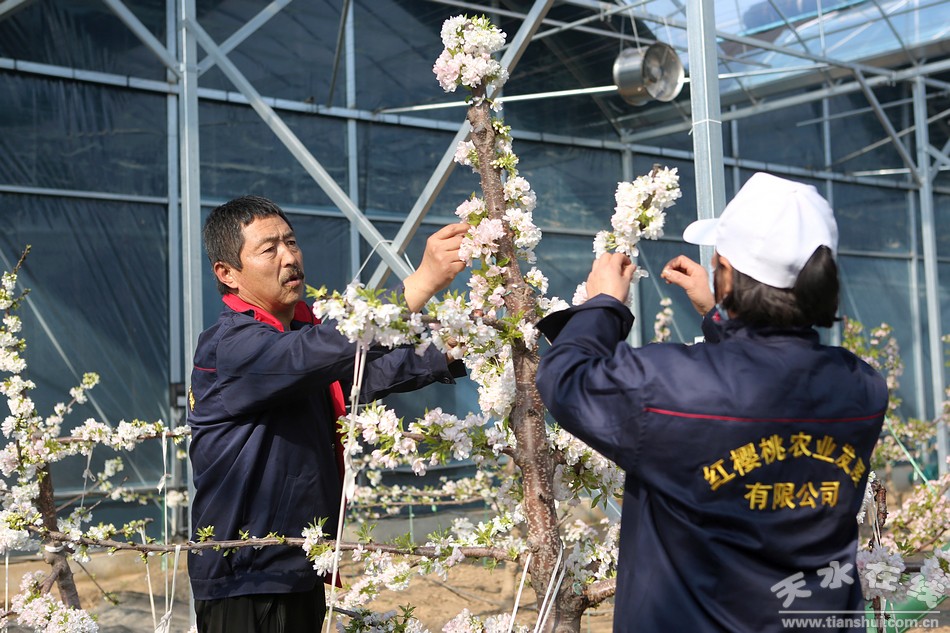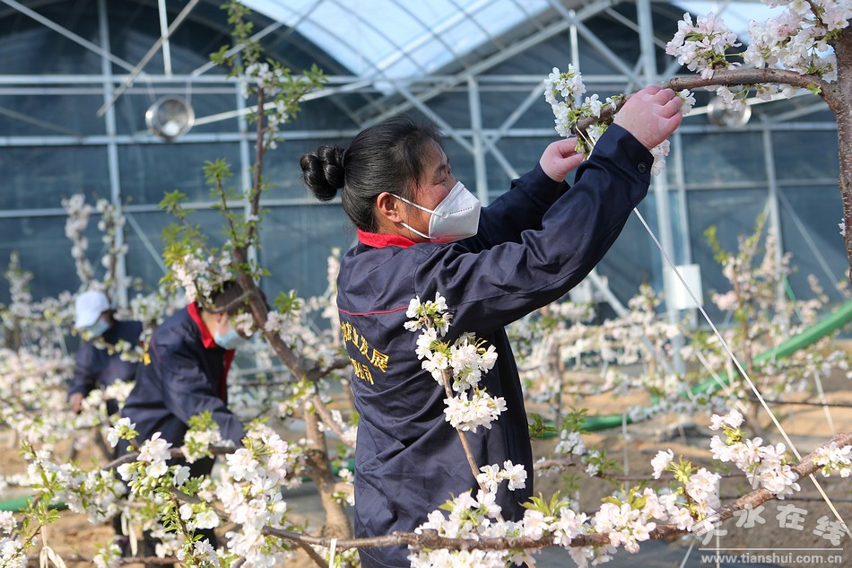 (天水紅櫻桃農(nóng)業(yè)發(fā)展有限公司的工作人員在疏花)