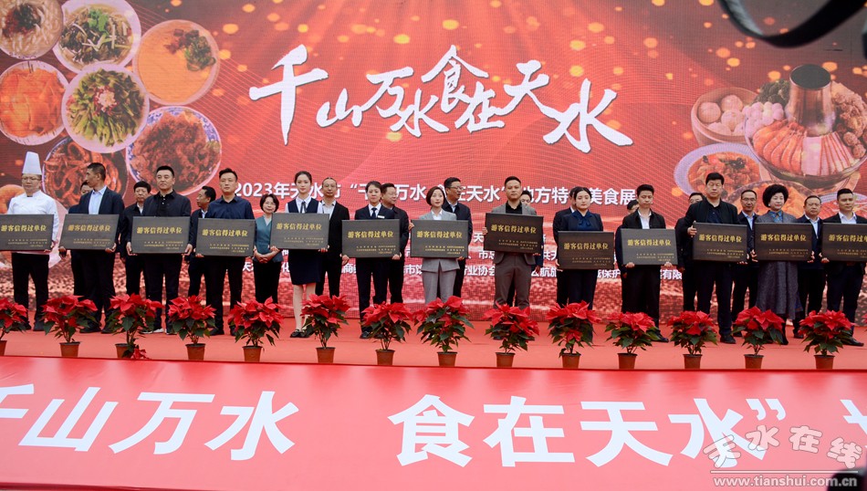 ▲“游客信得過單位”的凱悅大酒店、玫瑰大酒店、溢香園、老家八大碗餐飲店、濱河大酒店、悅海大酒店、渭川印象大酒店、張家川縣秦風(fēng)園酒店、甘谷縣金城大酒店、秦安縣秦都明悅大酒店、秦宜酒樓、常記呱呱、31號面皮13家企業(yè)代表上臺領(lǐng)取榮譽(yù)牌。