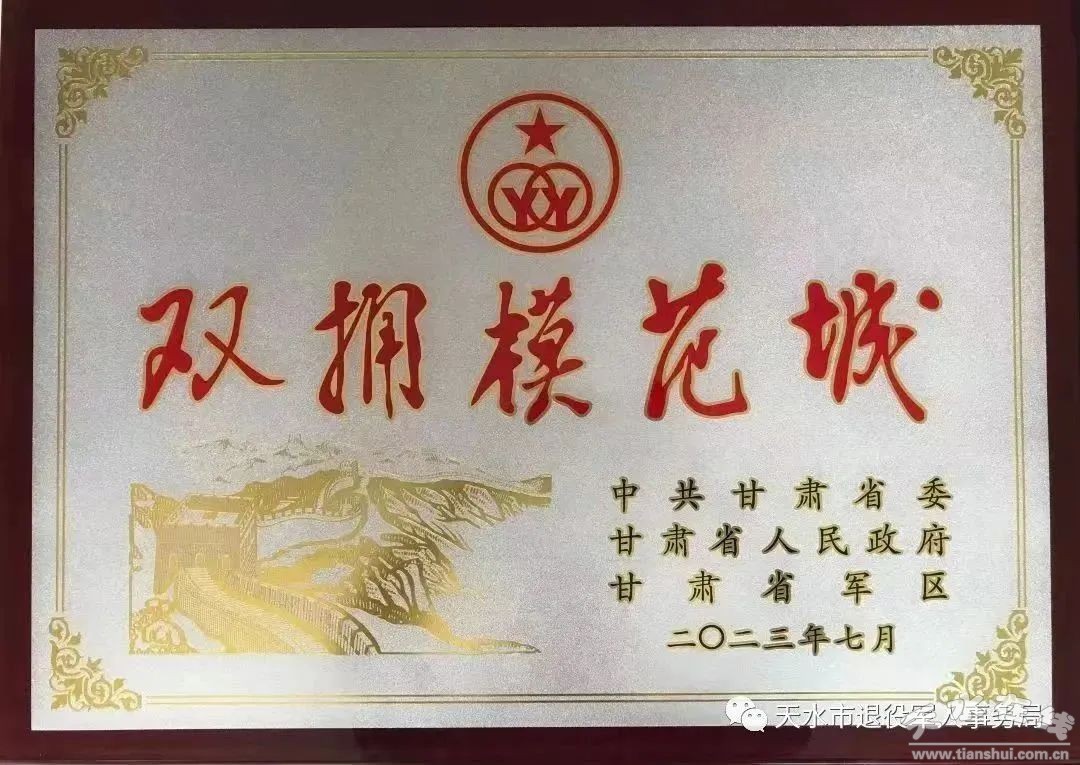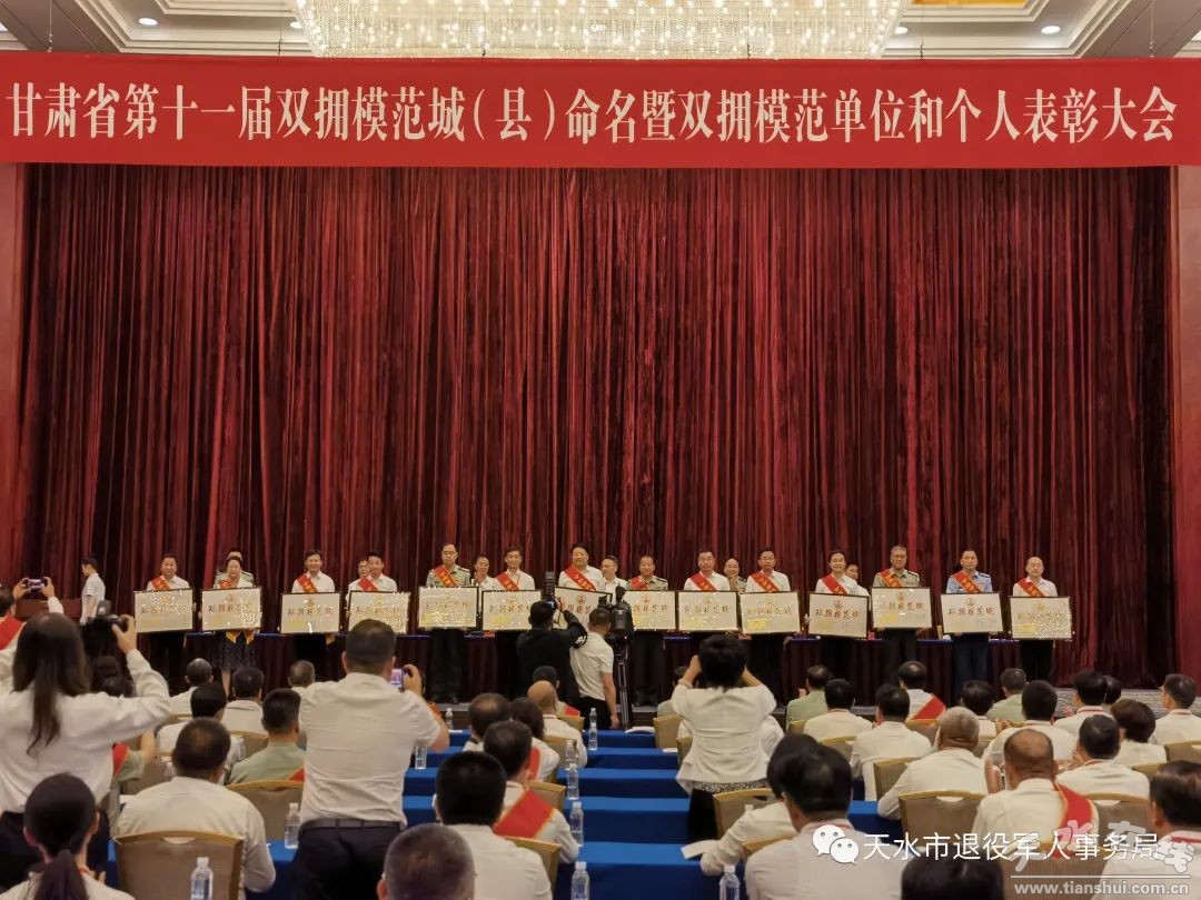 7月27日上午,甘肅省第十一屆雙擁模范城(縣)命名暨雙擁模范單位和個(gè)人表彰大會(huì)在蘭州隆重舉行。天水市及麥積區(qū)被中共甘肅省委、甘肅省人民政府、甘肅省軍區(qū)命名為“省級(jí)雙擁模范城”,秦安縣、清水縣、張家川縣被命名為“省級(jí)雙擁模范縣”,天水市財(cái)政局等5個(gè)單位被表彰為“甘肅省愛(ài)國(guó)擁軍模范單位”,96743部隊(duì)62分隊(duì)等2個(gè)單位被表彰為“甘肅省擁政愛(ài)民模范單位”,彭德川等6人被表彰為“甘肅省愛(ài)國(guó)擁軍模范個(gè)人”,俞江等3人被表彰為“甘肅省擁政愛(ài)民模范個(gè)人”。