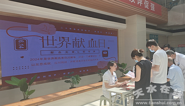 為呼吁廣大市民和醫(yī)院職工自愿加入無償獻(xiàn)血者隊伍,營造良好的社會氛圍,6月14日上午,天水市第四人民醫(yī)院組織開展了“世界獻(xiàn)血日”主題宣傳活動。此次宣傳活動我院制作了無償獻(xiàn)血的宣傳圖片,連續(xù)在醫(yī)院大廳滾動播放;發(fā)放了獻(xiàn)血相關(guān)知識的宣傳手冊60余冊;現(xiàn)場講解、答疑獻(xiàn)血相關(guān)的知識,使大家更加深刻地認(rèn)識到無償獻(xiàn)血對于拯救生命、維護(hù)社會和諧的重要性,同時表達(dá)了對無償獻(xiàn)血者“熱心公益、無私奉獻(xiàn)、挽救生命、大愛無疆”的崇高敬意。