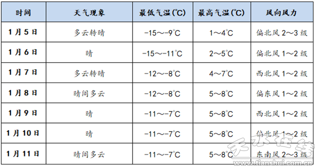 預(yù)計(jì)本周天水天氣晴好,無(wú)明顯降水。氣溫預(yù)報(bào)以秦州區(qū)為例,日最低氣溫-11~-7℃,日最高氣溫4~8℃。
