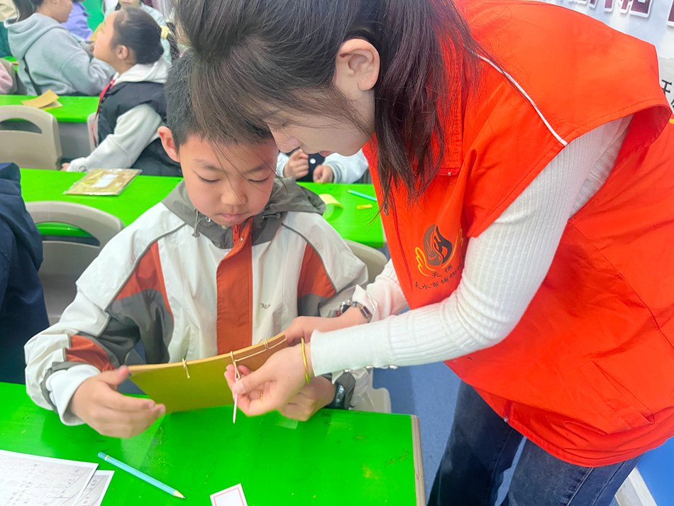 在彩陶精讀環(huán)節(jié),宣教老師引導青少年以小組為單位,圍繞彩陶的文化內涵、紋飾象征及其與先民生活的關聯(lián)展開深入探討。大家各抒己見,在交流中深化對彩陶文化的理解。同時研展了線裝書制作,同學們將對彩陶的解讀、彩陶經(jīng)典紋飾及個人感悟,匯編成冊,收錄于自制線裝書中。從折頁、打孔到穿線、裝訂,認真細致地完成每一道工序,讓文化感悟有了專屬載體。