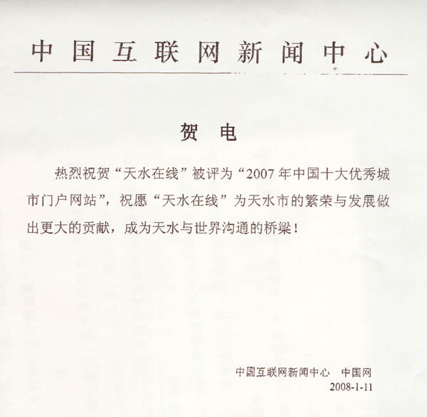天水在線被評為“2007中國十大優(yōu)秀城市門戶網(wǎng)站”