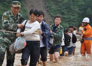 26日,根據(jù)前方災(zāi)情,消防大隊(duì)出動(dòng)搶險(xiǎn)救援車1臺(tái),隊(duì)員8名,挺進(jìn)搶險(xiǎn)救援重災(zāi)區(qū)四門鎮(zhèn)松樹村,當(dāng)搶險(xiǎn)救援車趕到堯兒村時(shí),發(fā)現(xiàn)前方道路塌陷,搶險(xiǎn)救援車無(wú)法通行,全體消防隊(duì)員只好汽車從簡(jiǎn),獨(dú)步繞行,順著山勢(shì),攀巖約25公里,歷時(shí)3個(gè)多小時(shí),13時(shí)50分來到受災(zāi)嚴(yán)重的松樹村?粗矍氨簧胶榍滞踢^的村莊,消防隊(duì)員忘記山路所帶來的疲憊,迅速投入到抗洪搶險(xiǎn)救援中,幫助村民迅速轉(zhuǎn)移物資,搭建帳篷,指導(dǎo)村民開展自防自救,確保人身安全。據(jù)不完全統(tǒng)計(jì),消防隊(duì)員共救助轉(zhuǎn)移被困群眾12人,糧食1200公斤、家電、家具等物資108件,搶救財(cái)產(chǎn)價(jià)值1.3萬(wàn)元,并幫助群眾搭建帳篷12頂。