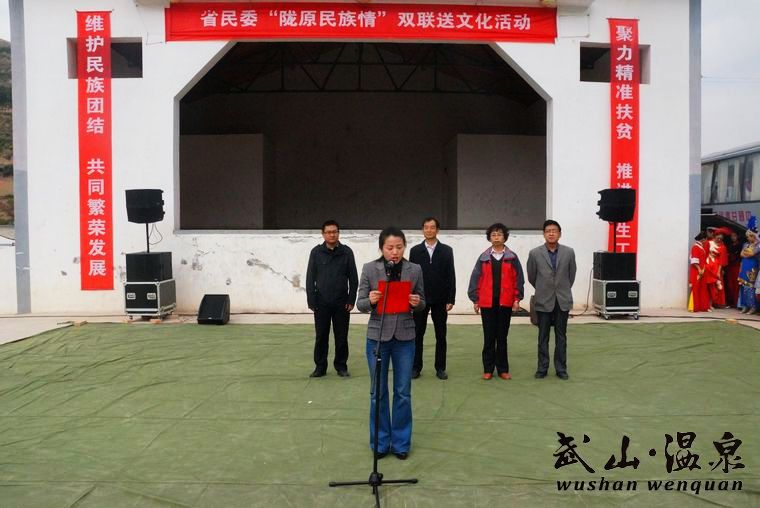 李菊霞在致辭中首先代表縣四大組織和溫泉鄉(xiāng)廣大農(nóng)民群眾向省民委、省民族歌舞團(tuán)赴溫泉鄉(xiāng)慰問(wèn)演出表示熱烈歡迎,向全體演職人員表示衷心感謝。 她說(shuō),溫泉鄉(xiāng)是武山縣貧困鄉(xiāng)鎮(zhèn),自精準(zhǔn)扶貧和雙聯(lián)行動(dòng)開展以來(lái),全鄉(xiāng)上下能夠按照省精準(zhǔn)扶貧“1+17”、市“1+18”及縣“1+20”實(shí)施方案,借力雙聯(lián)行動(dòng),圍繞富民產(chǎn)業(yè)培育、基礎(chǔ)設(shè)施建設(shè)、社會(huì)治安綜合管理、黨的建設(shè)等工作,緊貼實(shí)際,開拓進(jìn)取,各項(xiàng)工作扎實(shí)推進(jìn),特別是小南、英咀兩村,在省民委的幫扶下,群眾生產(chǎn)生活發(fā)生了可喜的變化。此次省民委開展“隴原民族情”雙聯(lián)送文化活動(dòng),將在溫泉鄉(xiāng)上下積極營(yíng)造昂揚(yáng)向上、奮發(fā)進(jìn)取的良好文化氛圍,對(duì)滿足群眾的精神文化需求,推動(dòng)溫泉經(jīng)濟(jì)、文化全面協(xié)調(diào)發(fā)展有重要意義。