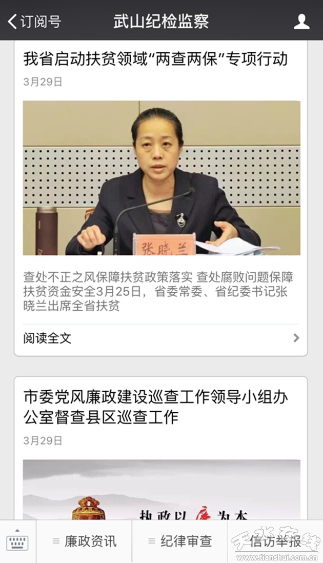 武山縣紀(jì)委將通過微信公眾平臺,綜合運用文字、圖片、視頻等多種形式,及時發(fā)布中央、省、市、縣紀(jì)檢監(jiān)察工作動態(tài),積極宣傳黨風(fēng)廉政建設(shè)方面的政策法規(guī),傳遞反腐倡廉“正能量”,為全縣黨風(fēng)廉政建設(shè)和反腐敗工作營造濃厚的輿論氛圍。同時,微信公眾平臺設(shè)有信訪舉報欄目,公布了舉報方式,積極回應(yīng)社會關(guān)切。(劉子林)